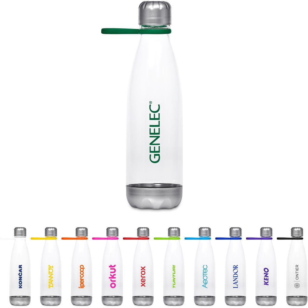 The silicone finger loop on this clear, plastic water bottle makes it easier to carry, especially when your hands are full. Branding on the bottle is especially effective when it matches with the colour accent of the loop.